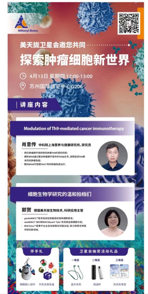 中國(guó)細(xì)胞生物學(xué)會(huì)第十八次代表大會(huì)暨2023年全國(guó)學(xué)術(shù)大會(huì)于4月10-14日在蘇州市舉行。本次大會(huì)主要分為學(xué)術(shù)交流(大會(huì)特邀報(bào)告、分會(huì)場(chǎng)報(bào)告、衛(wèi)星會(huì)議、墻報(bào)交流等)、工作會(huì)議、暖場(chǎng)活動(dòng)和特色活動(dòng)多種形式。分會(huì)場(chǎng)交流共分為27個(gè)主題開(kāi)展學(xué)術(shù)交流。其中美天旎公司還特邀中科院肖意傳博士開(kāi)展了“探索腫瘤細(xì)胞新世界”的相關(guān)講座。