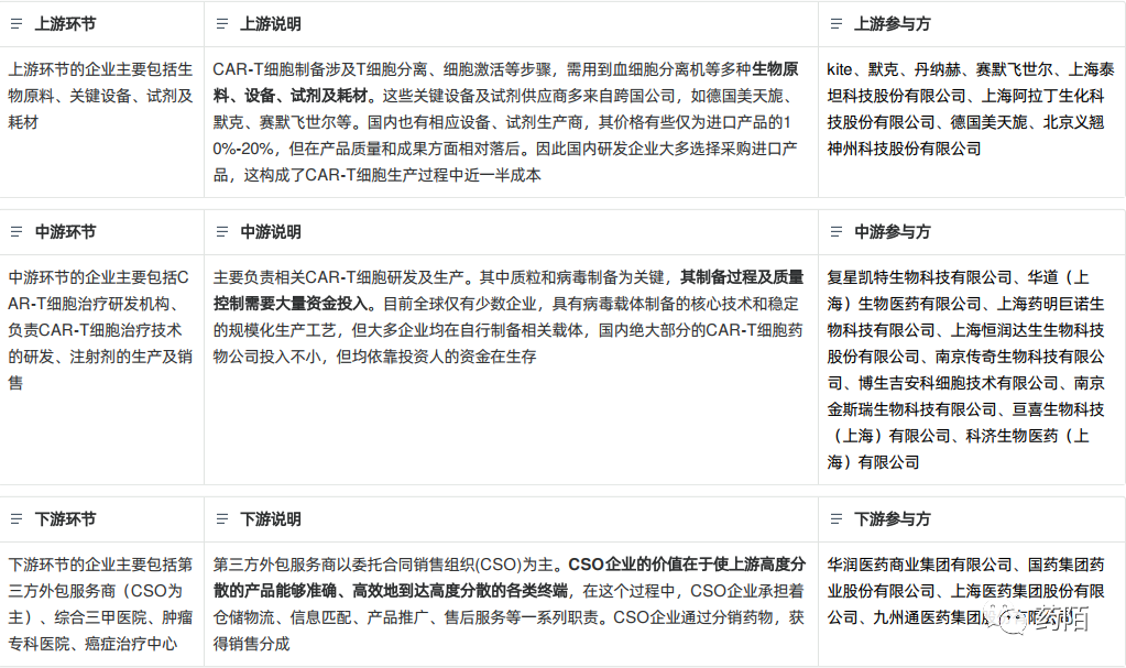 CAR-T細胞治療產業鏈可劃分為上、中、下游產業3個環節。上游環節的企業主要包括生物原料、關鍵設備、試劑及耗材,這些關鍵設備及試劑供應商多來自跨國公司,如德國美天旎、默克、賽默飛世爾等。中游環節的企業主要包括CAR-T細胞治療研發機構、負責CAR-T細胞治療技術的研發、注射劑的生產及銷售,其中質粒和病毒制備為關鍵,其制備過程及質量控制需要大量資金投入。下游環節的企業主要包括第三方外包服務商(CSO為主)、綜合三甲醫院、腫瘤專科醫院、癌癥治療中心。CSO企業的價值在于使上游高度分散的產品能夠準確、高效地到達高度分散的各類終端,在這個過程中,CSO企業承擔著倉儲物流、信息匹配、產品推廣、售后服務等一系列職責。CSO企業通過分銷藥物,獲得銷售分成。