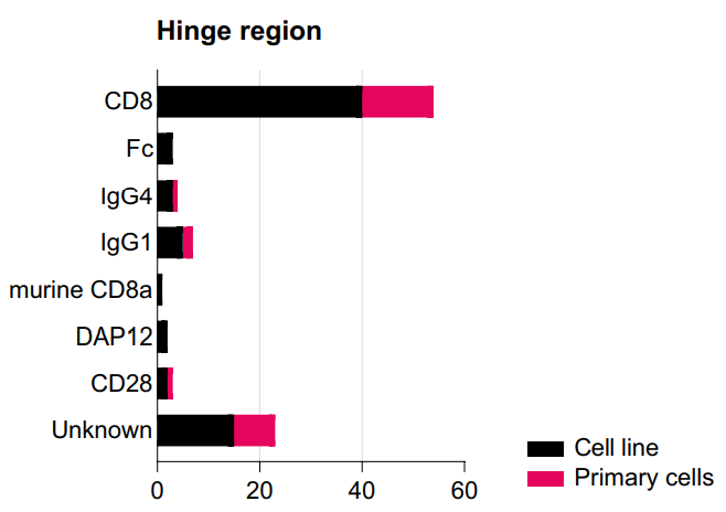 在CD28和CD8α鉸鏈區之間的直接比較中,發現CD28更有可能促進CAR分子的二聚化,因此,CD28鉸鏈區的CAR產生的激活刺激更強。雖然這可能是有益的,但也可能導致更嚴重的副作用。