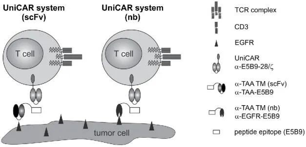 為了避免抗原逃逸,Mitwasi和他的同事開發了一種通用型CAR(UniCAR),帶有開關,以提高安全性和可控性。這項技術首先在針對E5B9的CAR-T細胞上得到驗證,E5B9是核抗原La-SS/B的肽表位。由于在細胞表面沒有發現這種蛋白,CAR-T必須通過一種稱為靶模塊(TM)的雙特異性分子定向到腫瘤。TMs通常以E5B9肽表位融合到抗TAA的單鏈抗體上。不同的TM可以聯合應用,以同時針對多個TAA,誘導CARs反應肽的異質性,而不存在靶向效應的風險。