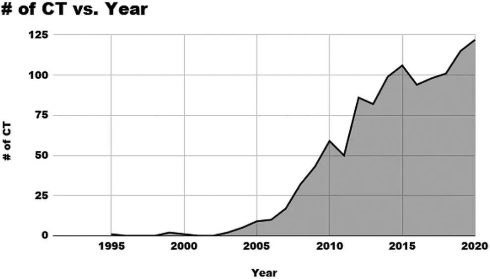 不同年份人間充質干細胞治療的臨床試驗數量變化圖
