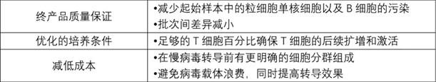越來越多的文獻表明,T細胞分選在CAR-T細胞制備中非常重要,直接影響到CAR-T細胞的抗腫瘤活性。Juno的早期創始人Stanley R. Riddell曾發表報道:CD19 CAR–T cells of defined CD4+:CD8+ composition in adult B cell ALL patients(ClinicalTrials.gov #NCT01865617)。文章主要介紹了限定比例的CD19-CAR T細胞在29例難治/復發急性B淋巴細胞白血病患者中的臨床治療效果,其中27例(93%)患者實現了骨髓水平的緩解。他指出:“與來自未分選的T細胞相比,有特定亞群的T細胞產生的CAR-T細胞產品具有更好的抗腫瘤效應。“在2017年CDE發布的《嵌合抗原受體修飾T細胞(CAR-T)制劑制備質量管理規范》中也明確建議:”對采集的外周血進行單個核細胞的分離及T細胞的分化,并對所分選出的T細胞進行刺激和活化。”進行T細胞分選可以帶來如下好處: